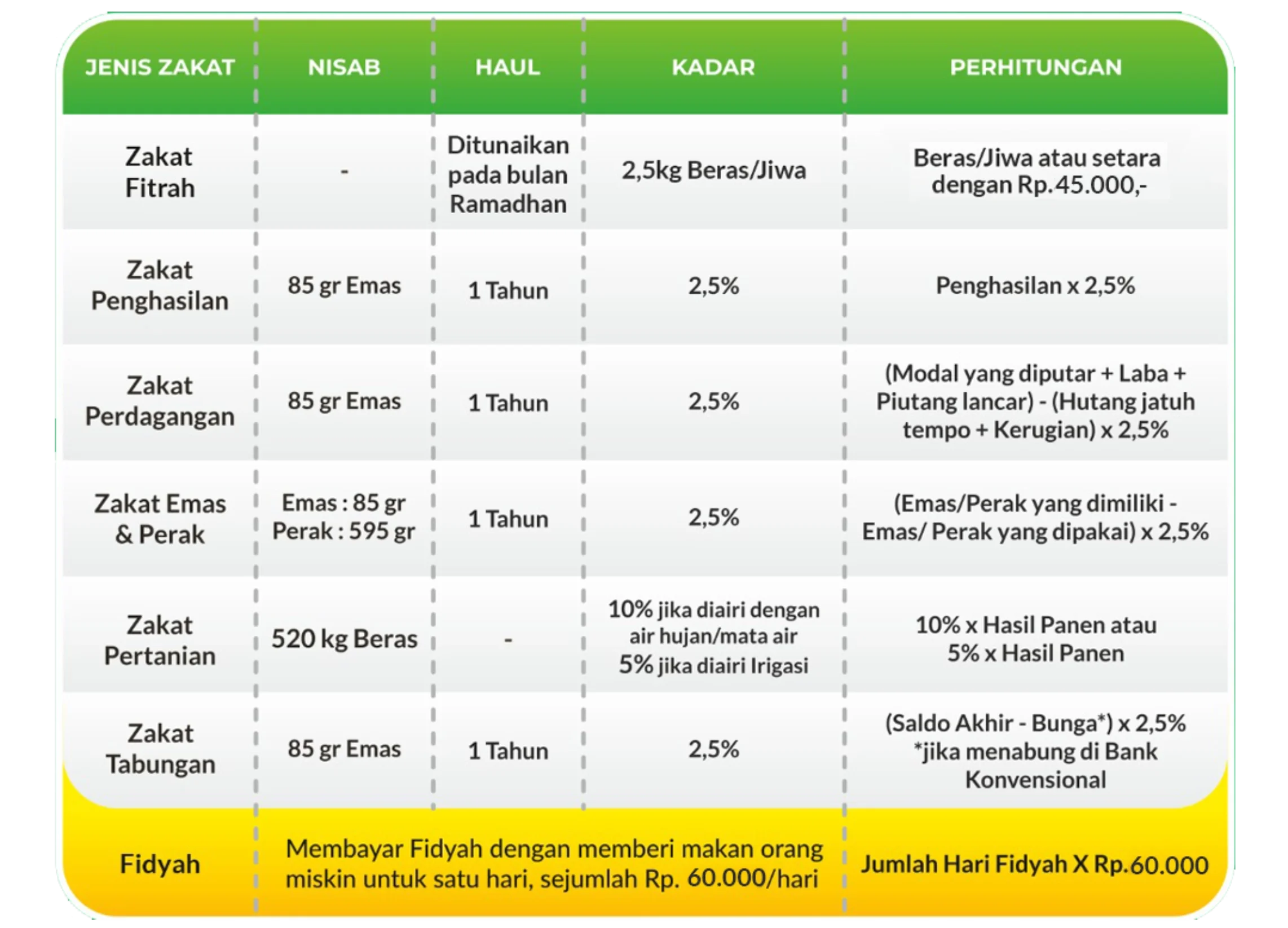 - Perak: Nisabnya 595 gram, zakatnya 2,5%.
